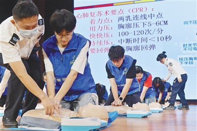 第三届中国国际消费品博览会志愿者在参加岗前急救培训。