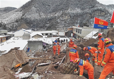 受冷空气影响,当地气温骤降,现场救援人员克服雨雪冰冻、道路受阻等困难,利用铲车、挖掘机、铁锹等,采取由上至下、层层削减的方式,对失踪人员被埋区域实施快速挖掘。同时,利用人工手刨的方法,对核心区实施安全保护式清理。