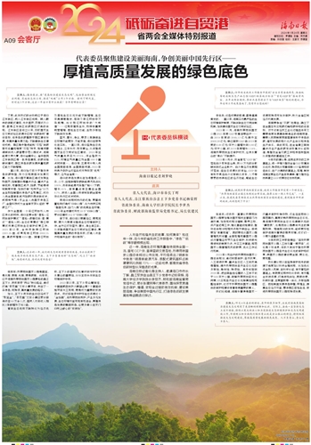 海南日报记者化身主持人,邀请海口市市长丁晖,昌江黎族自治县王下乡党委书记杨荣辉,海南大学经济学院院长李世杰,财政部海南监管局党组书记、局长张建民等代表委员,围绕探索贯通生态保护、增值、变现全过程的有效机制,建设美丽海南,争创美丽中国先行区,打造绿色低碳发展高地等话题进行探讨。