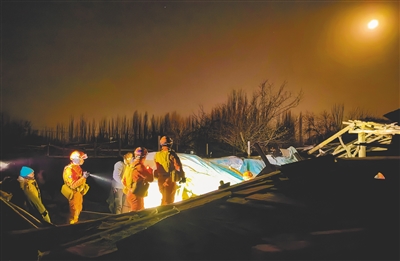 1月23日,在新疆乌什县亚曼苏柯尔克孜族乡,救援人员排查险情。新华社发