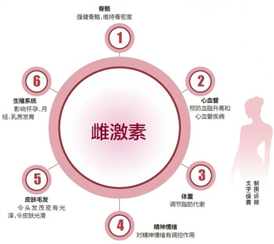 “女性除了生殖系统和雌激素有关,体内很多组织器官都有它的靶点。”采访中,海南省人民医院妇科主任医师洪澜介绍,雌激素的受体分布十分广泛,分布在子宫、阴道、乳房、盆腔以及皮肤、膀胱、尿道、骨骼和大脑,因此雌激素不仅有促进和维持女性生殖器官和第二性征的生理作用,对人体内分泌、心血管、代谢系统、骨骼的生长和成熟,皮肤等均有明显的影响。