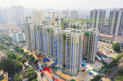 位于海口市龙华区的海垦·安悦兰亭安居房项目,8栋住宅楼呈环形排列,工人正忙着进行室内装修等工作,项目建成后将提供631套安居房。