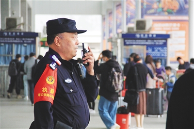 民警梁东佩戴着红袖标,帽檐下的双鬓全是白发,站在人流中提醒乘客:“人证票要一致,不要挤、不要急!”