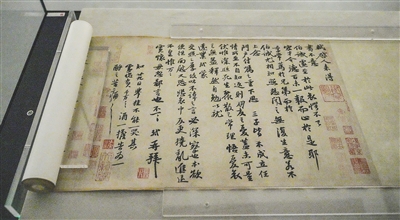 据了解,目前包括“宋四家”真迹在内的21件来自故宫博物院的文物均已到位。在展馆里,记者首先看到了“宋四家”中最年长的一位——蔡襄的真迹《京居帖》。此帖是蔡襄写给友人的一封问候信札,前半部分以行书为主,后半部分逐渐转为草书,用笔清隽秀润,体势自然流动,兼有王羲之和颜真卿之风,集中反映了蔡襄在这两种书体上的高超造诣。