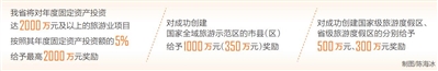 在固定资产投资奖励方面,我省将对年度固定资产投资2000万元及以上的旅游业项目,按照其年度固定资产投资额的5%给予最高2000万元奖励。