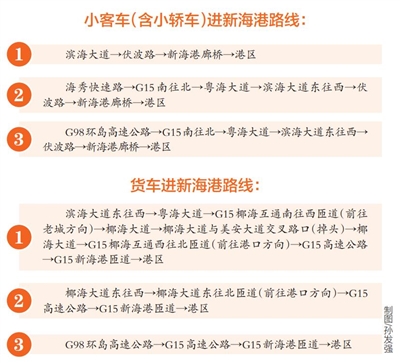 同时,按照客、货分离的管控方式,小客车(含小轿车)统一由伏波路进新海港,货车统一由G15新海港匝道进新海港。海口市交警支队将根据市区道路交通流量的实际状况,适时对三港周边路段实施交通管制。