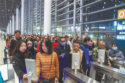 1月28日晚,海口新海港,过海旅客使用身份证快速通过闸机。本报记者 李天平 摄
