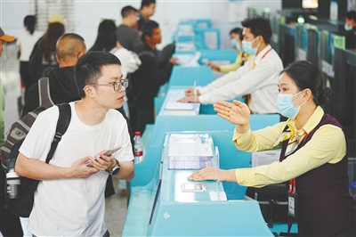 1月28日,三亚凤凰国际机场航站楼,机场工作人员为旅客办理值机手续。本报记者 王程龙 摄