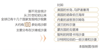 据不完全统计, 从20世纪初以来,全球已有十几个国家发现鸣沙现象,大约有100多处鸣沙群,主要分布在沙滩或沙漠。比如美国的长岛、马萨诸塞湾,英国的诺森伯兰海岸,丹麦的波恩贺尔姆岛,波兰的科尔堡,蒙古国的戈壁滩,智利的阿塔卡玛沙漠,沙特阿拉伯的一些沙滩和沙漠等,都存在鸣沙现象。