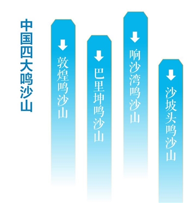 鸣沙现象地域分布广,发出来的声音也多种多样。敦煌的鸣沙山,沙峰起伏,无边无际,每到晴天时,会听到鸣沙山响起的声音犹如丝竹弦声,为此也被人称为“沙岭晴鸣”。而美国夏威夷群岛中的高阿夷岛上的沙滩,脚踩上去会发出阵阵像狗叫一样的声音,人们也因此称之为“犬吠沙”。