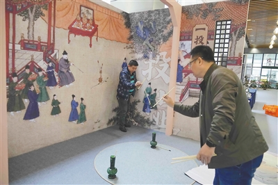 1月29日,作为“千古风流 不老东坡——苏轼主题文物展”配套活动之一的东坡文创集市布展进入收尾阶段。 据了解,东坡集市划分为展售区、文创活动区及宋代娱乐项目区等。图为宋代娱乐项目投壶。本报记者 张茂 摄