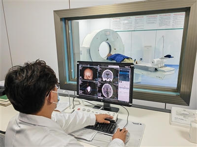 保亭黎族苗族自治县响水镇中心卫生院的CT室内,医生正为患者检查头部。原图为新华社记者 夏天 摄