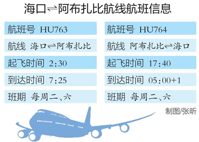 海南航空海口⇌阿布扎比国际航线于1月30日起每周执行2个往返航班,去程航班计划于02:30从海口起飞,当地时间7:25抵达阿布扎比,飞行时长预计8小时55分钟;返程计划于当地时间17:40从阿布扎比起飞,抵达海口时间为次日05:00,飞行时长预计7小时20分钟。以上航班信息以实际查询为准。