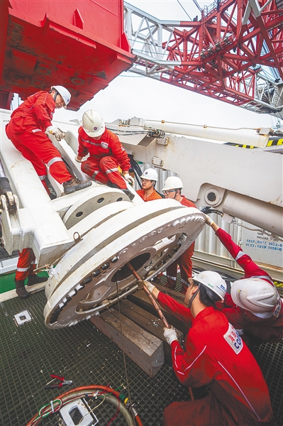 1月29日,在“蓝鲸7500”起重工程船上,技术人员正在进行导管架扶正作业。