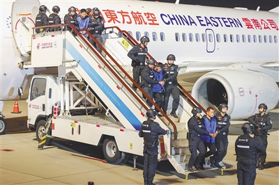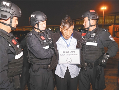 1月30日,在云南昆明长水机场,白所成、白应苍、魏怀仁、刘正祥、刘正茂、徐老发等10名缅北重大犯罪嫌疑人被我公安机关成功押解回国。 新华社记者 殷刚 摄