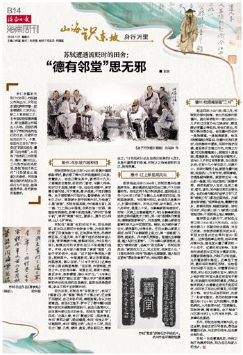 因为东坡,苏轼自号“东坡居士”,他写了《雪堂记》,称“雪堂”得名于下雪之时,还绘雪于四壁间,自己仰卧环视,满眼皆雪,自以为性便意适。故在《江城子·梦中了了醉中醒》说居黄州犹如东晋陶渊明居斜川,说自己是黄州人,欲在黄州度过自己的余生。苏轼在“雪堂”写了四戒:“出舆入辇,命曰‘蹶痿之机’;洞房清宫,命曰‘寒热之媒’;皓齿蛾眉,命曰‘伐性之斧’;甘脆肥浓,命曰‘腐肠之药’;此三十二字,吾当书之门窗、几席、缙绅、盘盂,使坐起见之,寝食念之。”(《书四戒》)这出自西汉枚乘的《七发》,本是对富贵者的告诫,苏轼以之告诫被贬的自己,别有深意。