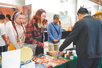 2月1日,在省博物馆东坡集市,外籍观众选购文创产品。