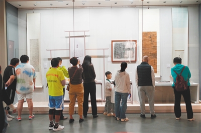 10时,展馆里的人群摩肩接踵,络绎不绝,在展柜前,大家错着肩膀看、伸长脖子看、排队看,都不愿错过任何一件展品。由于入馆看展人数过多,省博物馆采取了展厅限流措施,东坡1号馆门前,又再次排起长龙。
