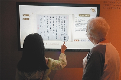 2月1日,展览现场,观众通过电子屏幕观察文物细节。