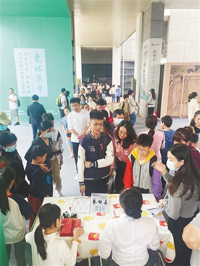 12时,当天上午已有6492人入馆,远超平日同一时间段的水平。在东坡集市里,海南日报打卡盖章点吸引了许多观众,男女老少排队背诵东坡诗词,用集章的方式打卡苏轼主题文物展。“现场氛围热烈得像在过年!”专程从文昌赶来的观众游玉婷感慨。