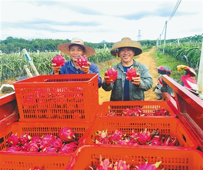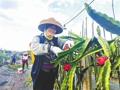 近日,儋州市雅星镇,海南农垦八一总场公司长岭火龙果基地挂果成熟,农户穿梭其间忙碌采摘火龙果。