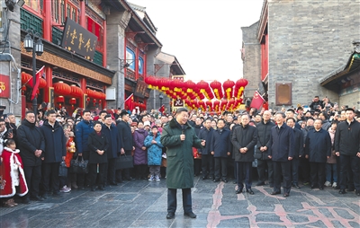当天下午,习近平来到天津古文化街。街道古色古香,习近平沿街步行,先后走进桂发祥十八街麻花、果仁张、泥人张、杨柳青年画等特色店铺,了解产品种类、销售和传统文化传承发展等情况,同店铺业主、员工和现场群众互动交流。他说,各级党委和政府要加强节日期间民生商品的产销保供,确保数量充足、品类丰富、质量可靠,让广大群众放心消费、快乐过年。习近平指出,中国式现代化离不开优秀传统文化的继承和弘扬,天津是一座很有特色和韵味的城市,要保护和利用好历史文化街区,使其在现代化大都市建设中绽放异彩。