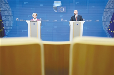 2月1日,欧洲理事会主席米歇尔(右)、欧盟委员会主席冯德莱恩出席新闻发布会。新华社发
