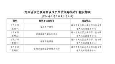 根据日程安排,2月5日至8日,省水务厅、省退役军人事务厅、省国资委、省地方金融监督管理局相关负责人将分别于海南省海口市美兰区大英山西二街4号“海南省人民来访服务中心”接访群众。