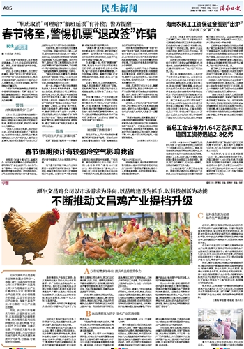 作为海南省农业产业化重点龙头企业,潭牛文昌鸡公司立足本土,充分发挥文昌鸡原产地优势,塑造种业核心竞争力,实施差异化品牌战略,在育种、养殖、产品研发及加工、销售等环节进行全链条优化,积极助力海南打造高品质、有口碑的特色产业。