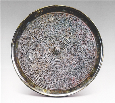 西汉“大乐富贵”铭铜镜上的蟠螭[pánchī]纹。扬州博物馆藏
