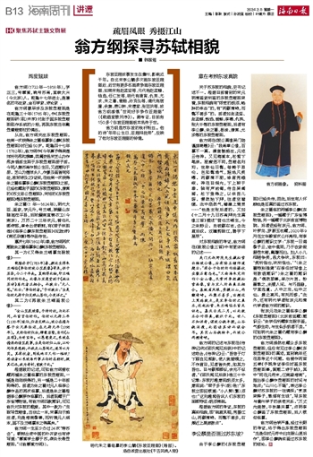 翁方纲的记述与东坡在《传神记》和《邵氏闻见后录》中的记述吻合。《传神记》云:“吾尝于灯下顾自见颊影,使人就壁模之,不作眉目,见者皆失笑,知其为吾也。目与颧颊颇似,余无不似者。”《邵氏闻见后录》卷三十中记载:东坡打趣秦观胡须太多,秦观说:“君子多乎(胡)哉?”东坡立即回敬道:“小人樊(繁)须也!”这则趣闻告诉人们东坡的面部特征:胡须稀疏。