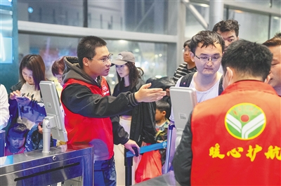 近日,在海口新海港,身穿红色马甲的志愿者引导旅客通过闸机。本报记者 李天平 摄