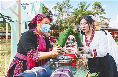 ② 2月3日,2024年五指山市“村晚”示范展示活动在五指山水满乡毛纳村举行。图为村民在包粽子。通讯员 张江英 摄