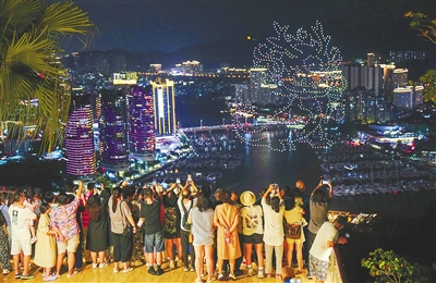 冬日的海南,碧海蓝天,景色宜人,我省各地举办了丰富多彩的文化活动,推出了别具特色的旅游产品,吸引了来自全国各地的游客。① 2月5日晚,1000架无人机组成的方阵,伴随音乐腾空而起,组成神龙戏珠等展示年味民俗或三亚独特景物风物的图案。