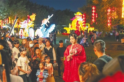 ③ 2月3日晚,十多组来自“花灯之乡”自贡市的龙年主题花灯在海口美舍河凤翔湿地公园点亮。图为靓丽的传统服饰吸引市民游客欣赏。本报记者 李天平 摄