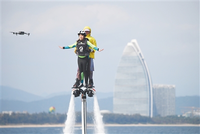 二月四日,在海南省三亚市蜈支洲岛旅游区,游客体验动感飞人项目。新华社记者 赵颖全 摄