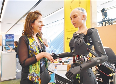 在瑞士日内瓦“人工智能造福人类全球峰会”上,一名参会者与仿真机器人索菲亚互动。