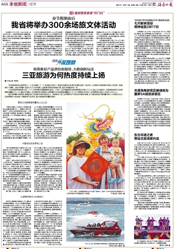 本报八所2月6日电 (记者张文君 特约记者方宇杰)文艺演出市场持续火热,带动文旅消费升温。2月5日晚,在东方市文化广场,为期5天的2024东方非遗之夜暨“村晚”文旅系列活动落幕。此次系列活动共吸引人流约5.4万人次,实现旅游综合收入约2831.42万元。活动举办期间,东方八所镇旅游饭店的入住率高达79.46%。2月5日晚,东方市文化广场,人山人海,热闹非凡,正对着舞台的台阶上,坐满了观看演出的市民游客。当晚,最后一场文艺演出在这里举行。来自该市八所镇福民社区的大合唱《大中华》、东海社区的舞蹈《龙娃闹春—福满东方》、永安社区的独舞《月光下的凤尾竹》、解放社区的独唱《搁浅》《狼》、琼西社区的舞蹈《灯火里的中国》等10多个群众自导自演的节目一一“亮相”,引得台下阵阵掌声和欢呼声,不少观众不由自主拿出手机记录美好瞬间。
