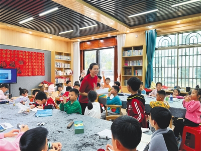 记者看到,在龙江镇蓝山村党群服务中心旁,一栋小楼挂着“蓝山书屋”牌匾,有两间宽敞明亮的教室,孩子们被分成2个班,由村里的返乡大学生带着一起参与书法、手语、舞蹈等课程。“这栋小楼在去年以前一直闲置着,没想到改造成书屋开设托管班后会这么热闹。”钟和透过教室窗户,看着孩子在教室里玩耍,满脸笑意。
