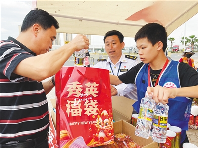 周永平(中)和周楷烨(右)在应急保障服务点为旅客派送应急保障物资。 本报记者 习霁鸿 摄