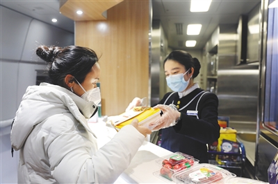 2月5日,G8326次列车旅客在选购热链餐。新华社发