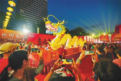 新春游园会现场,一条长10米、高4米的神龙造型花灯惟妙惟肖,引得游人纷纷驻足拍照。“花灯一摆,年味就有了。”来自辽宁的游客王莉说,她每年春节都会去赏花灯,与往年不同的是,今年穿着短袖赏花灯,这是在三亚才能有的体验。