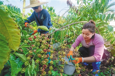 2月8日,位于琼中黎族苗族自治县黎母山镇的海南农垦母山咖啡标准化咖啡种植基地,海南农垦种植户穿梭其间忙碌采摘咖啡鲜果。文/本报记者 邓钰 图/本报记者 袁琛