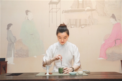 “点茶是宋代的一种沏茶方法,将碾好的茶叶末放在茶碗中,注入少量沸水调成糊状,再分多次注入沸水……”茶艺师现场演绎点茶技艺,投茶、冲泡、倒茶……展馆里茶香氤氲,给人以无穷的回味。