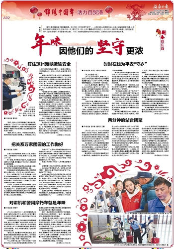 春节,意味着回家,意味着团圆。但,还有一种年味是“坚守”——从港口码头到高铁车站,从海上运输到路面交通,从农贸市场到110指挥大厅,在除夕这一天,港口工作人员、公安干警等依然在岗位上,尽心尽力、尽职尽责,畅通人们的回家路,守护万家的幸福年,书写新春“敬业福”。今天,本报特别聚焦坚守岗位的他们,记录他们守护浓浓年味的故事。