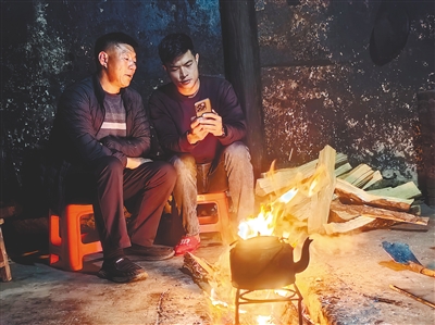 2月9日,在云南省南华县兔街镇半坡村,彝族小伙阿玉龙与父亲围坐在炉火边。