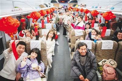 2月9日,在D38次列车上,武汉客运段汉口城际动车组车间“凤舞楚天”乘务组为乘客发放饺子,大家一起吃饺子过除夕。(本栏图片均由新华社发)