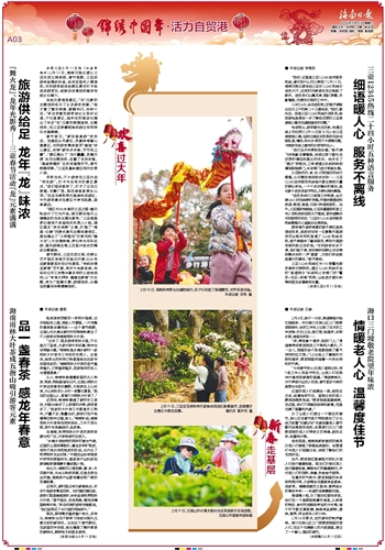 甲辰龙年,不少游客在三亚开启“寻龙游”,打卡与龙有关的景区景点。“我们很早就来了,打卡了过龙江索道、龙雕广场,现在准备直接去山顶。”在亚龙湾热带天堂森林旅游区,中外游客漫步在景区中赏花观景,登高望远。
