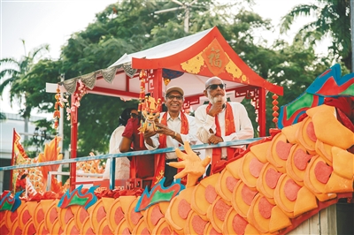 ① 2月3日,在毛里求斯首都路易港,毛里求斯副总理胡斯努(左)参加花车巡游活动。