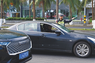 ① 2月13日,一名交警在海口港路口引导过海车辆。